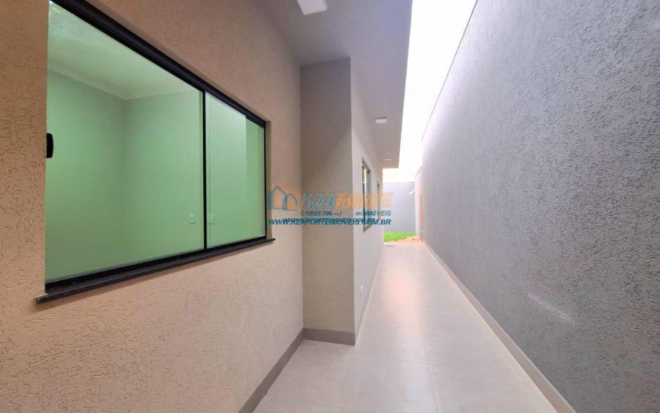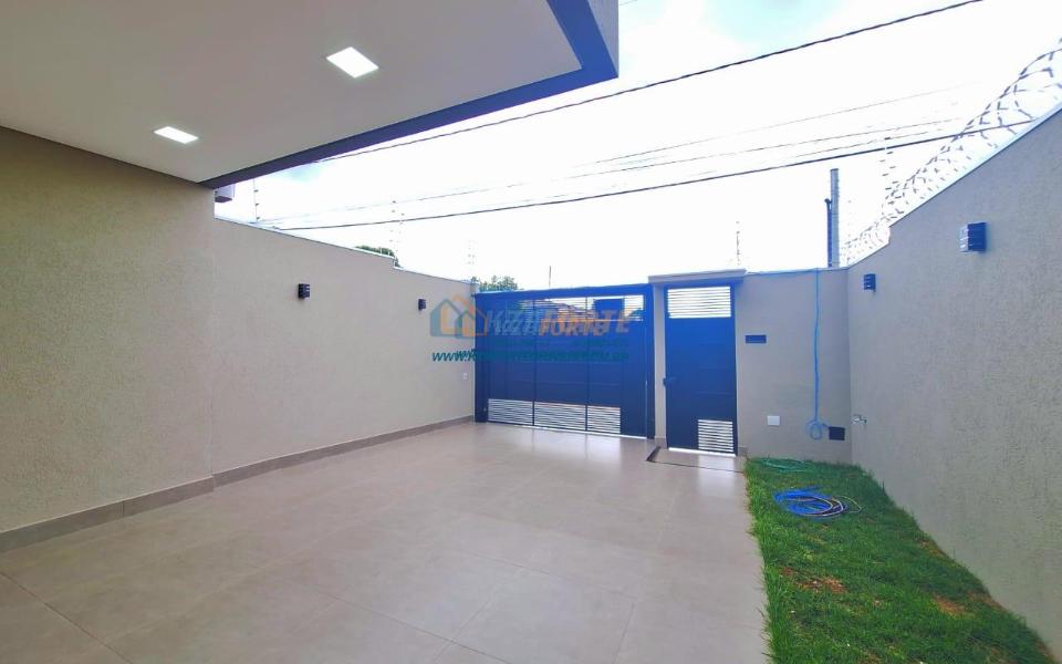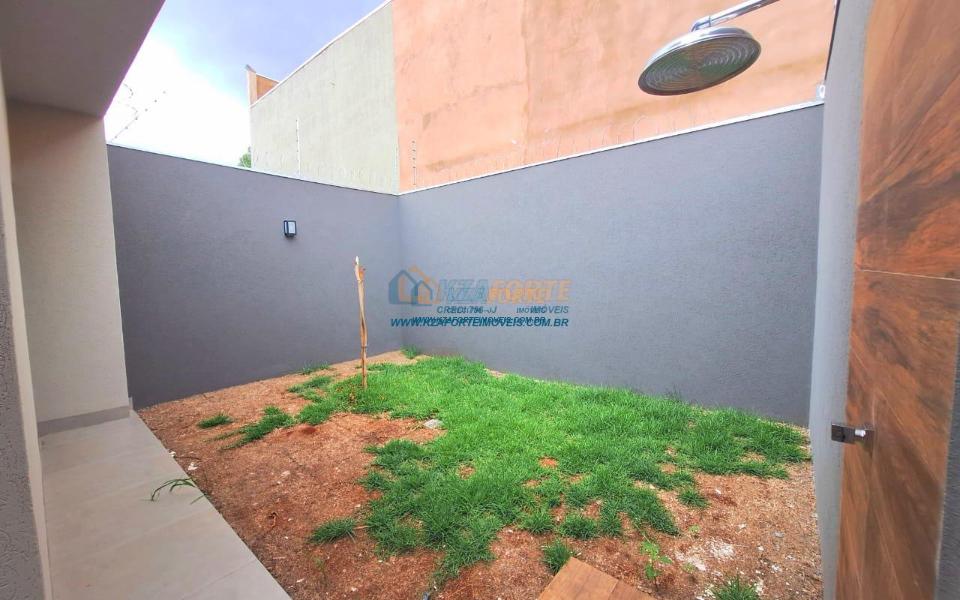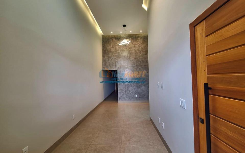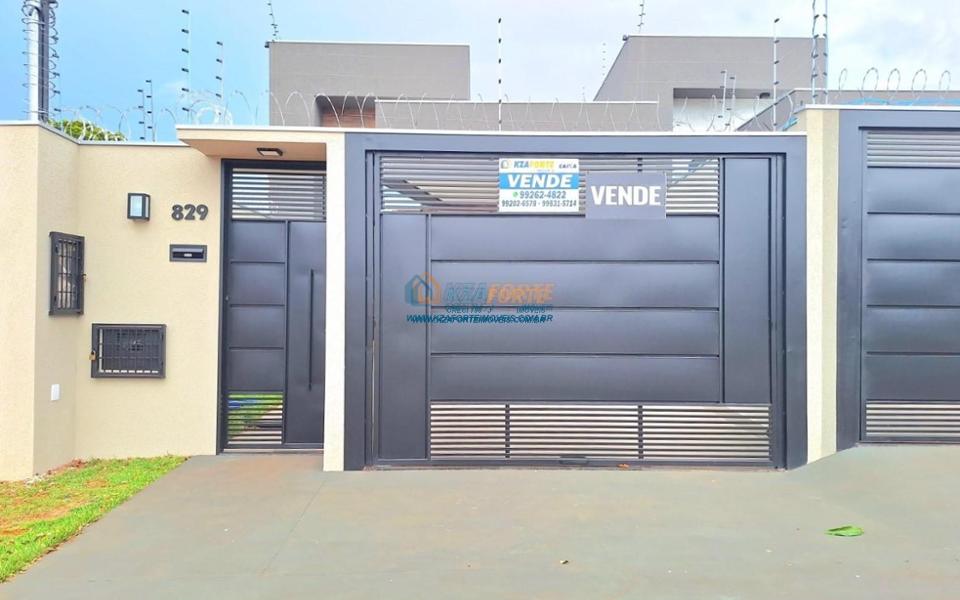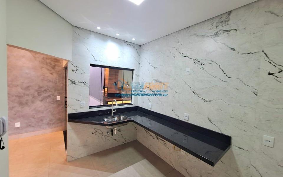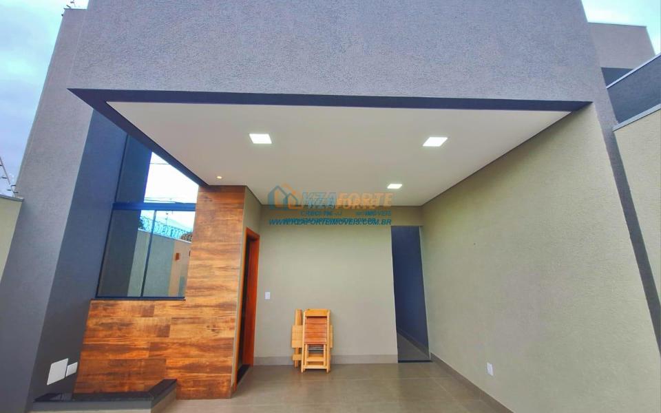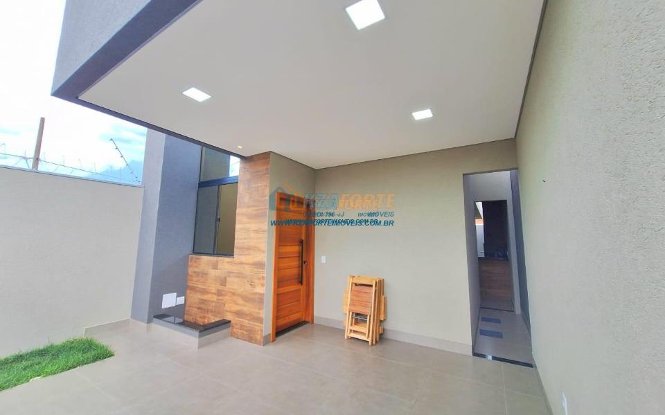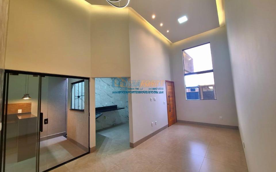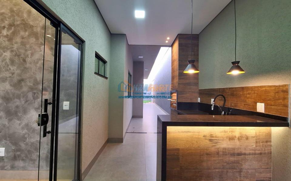 Casa nova com acabamento de alto padrão, pé direito duplo, forro de laje, teto com rebaixamento em gesso e iluminação em led, acabamento em mármore preto, pisos em porcelanato, sala de estar, sala de jantar, cozinha independente da sala, três quartos sendo um deles uma suíte, todas as torneiras monocomando, vidros temperados em todos os ambientes, banheiro com box, pré instalação de água quente, pré instalação para ar condicionado em todos os ambientes, área gourmet com churrasqueira, cerca elétrica, alarme, concertina nos muros, portão de elevação, interfone, garagem para 2 carros sendo 1 coberto. Cozinha, área gourmet e banheiros com mármore branco. Excelente localização, próxima ao Supermercado Assaí e Shopping Norte Sul Plaza. Aceita financiamento.