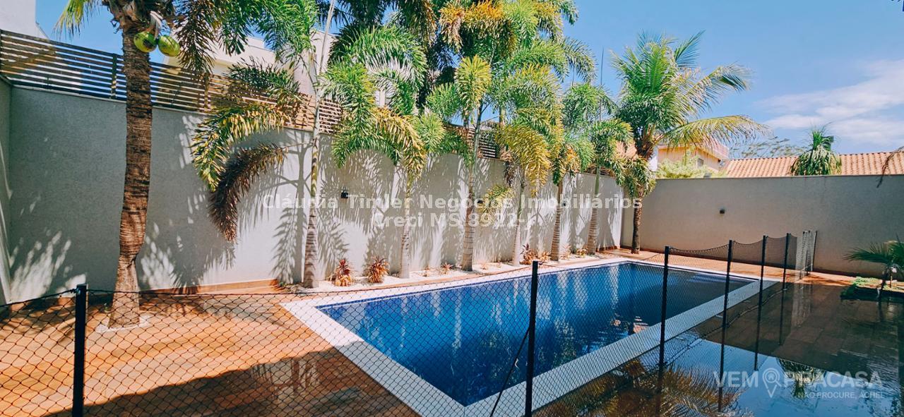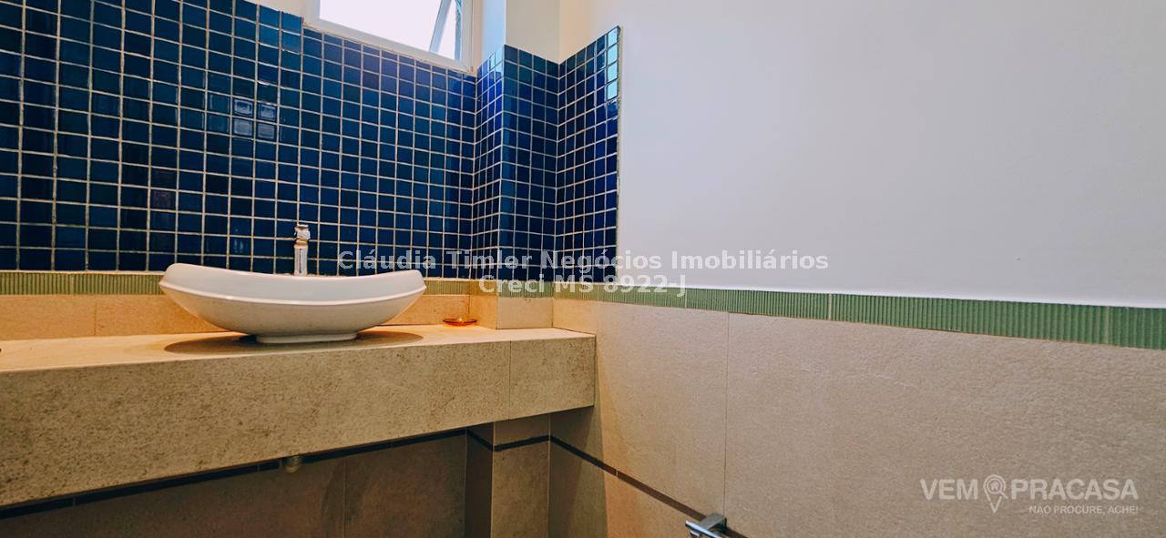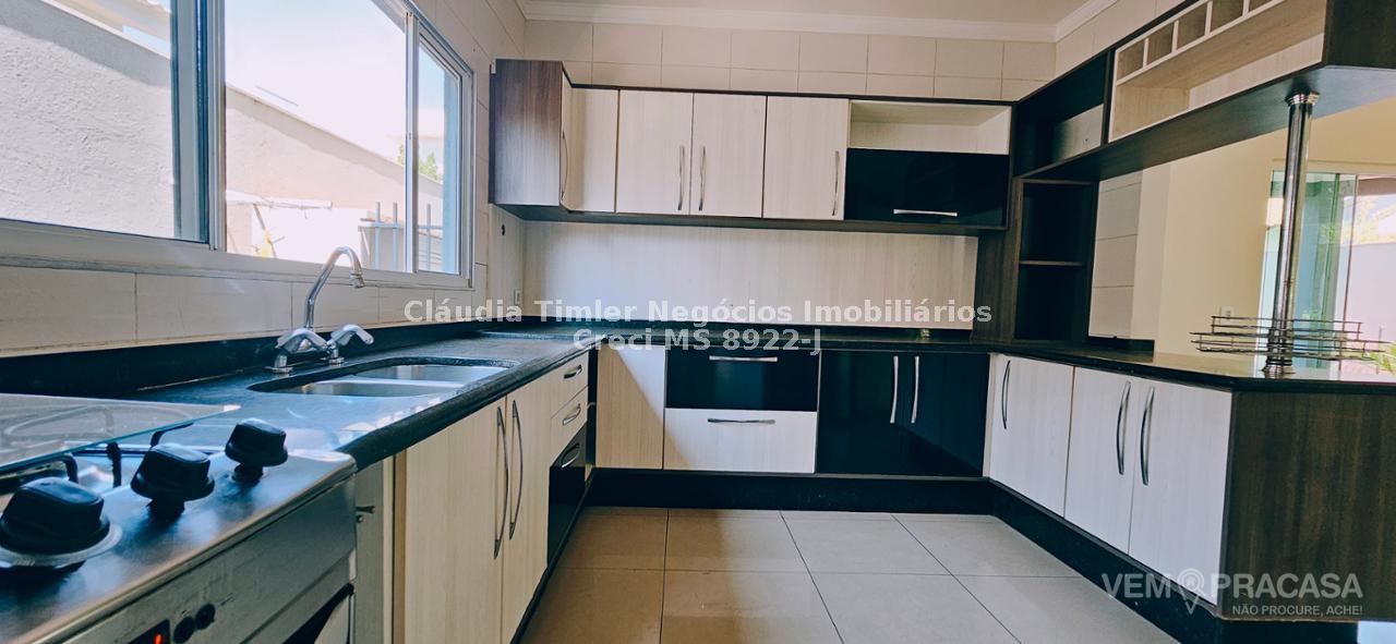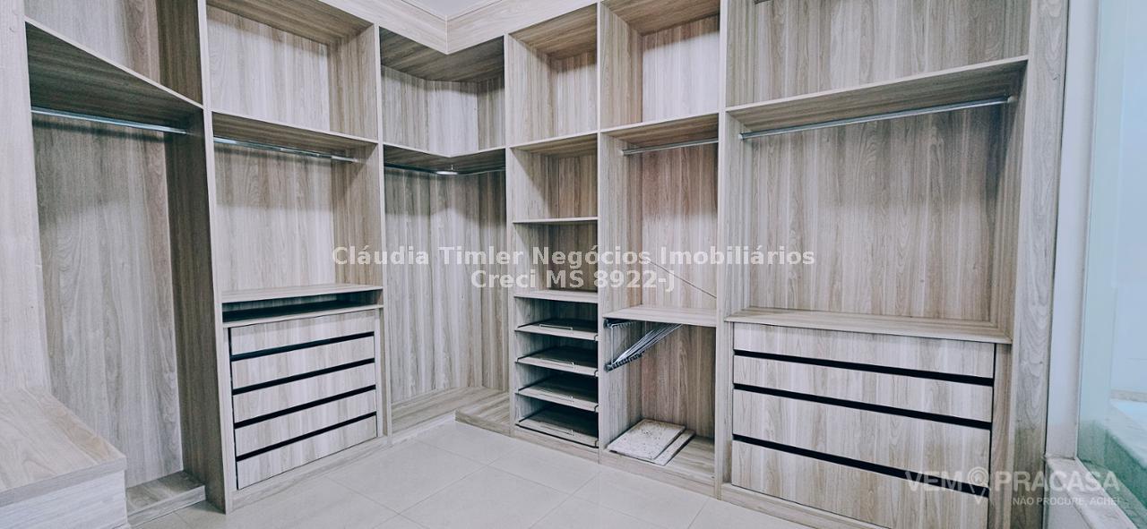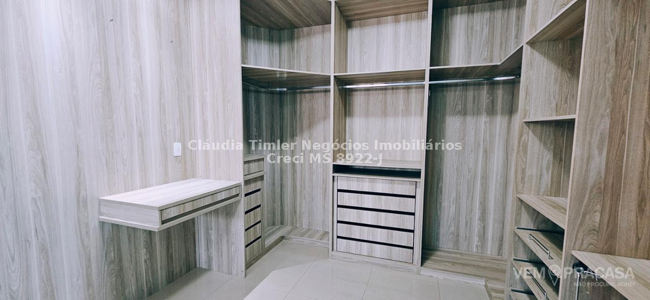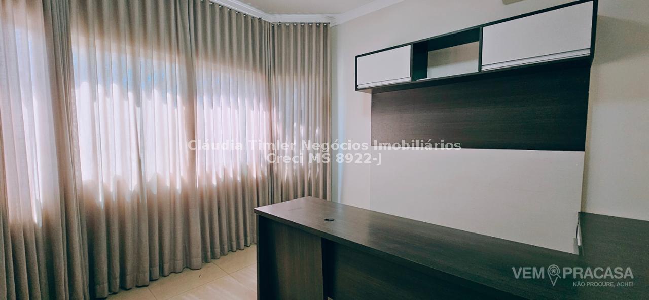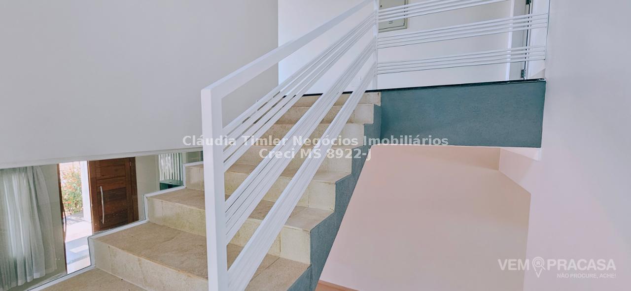 Piso inferior: sala de TV com painel, sala de estar, lavabo, sala para escritório com painel e ar condicionado, sala de jantar, cozinha com armários planejados, geladeira, fogão e coifa, lavanderia, despensa com prateleira.