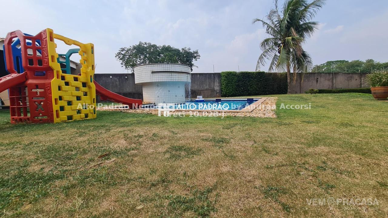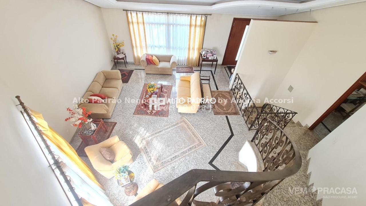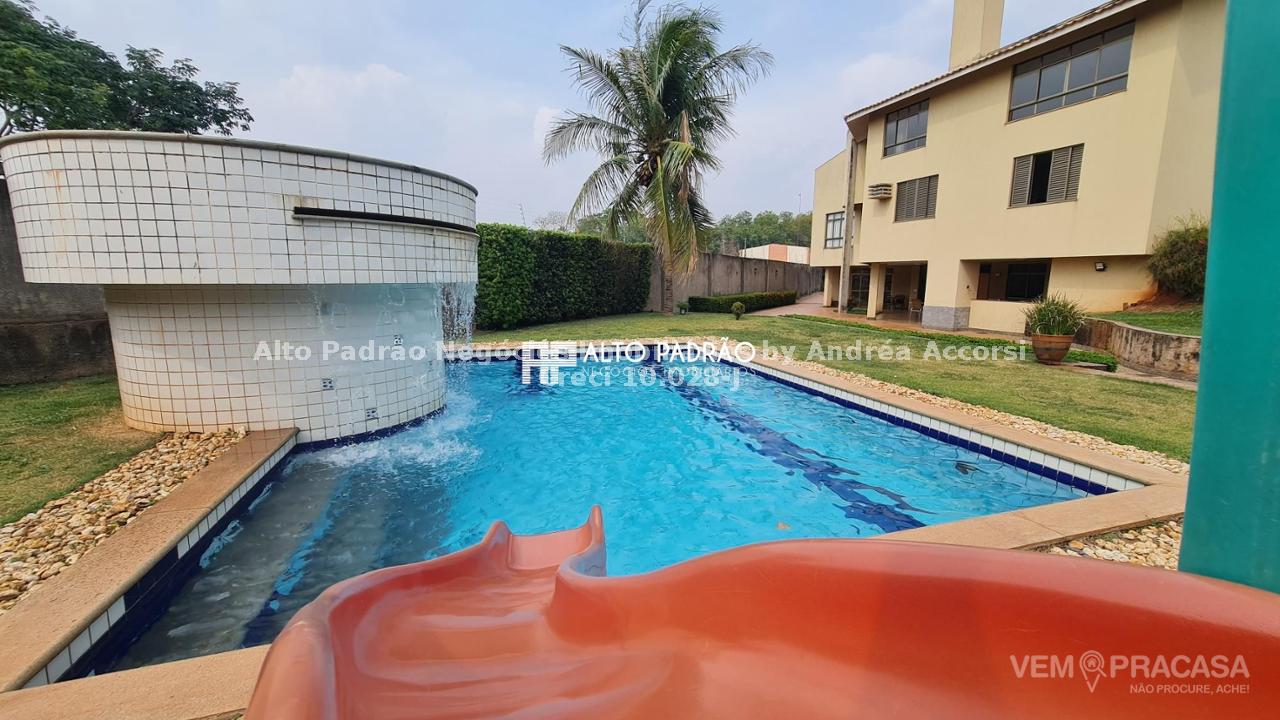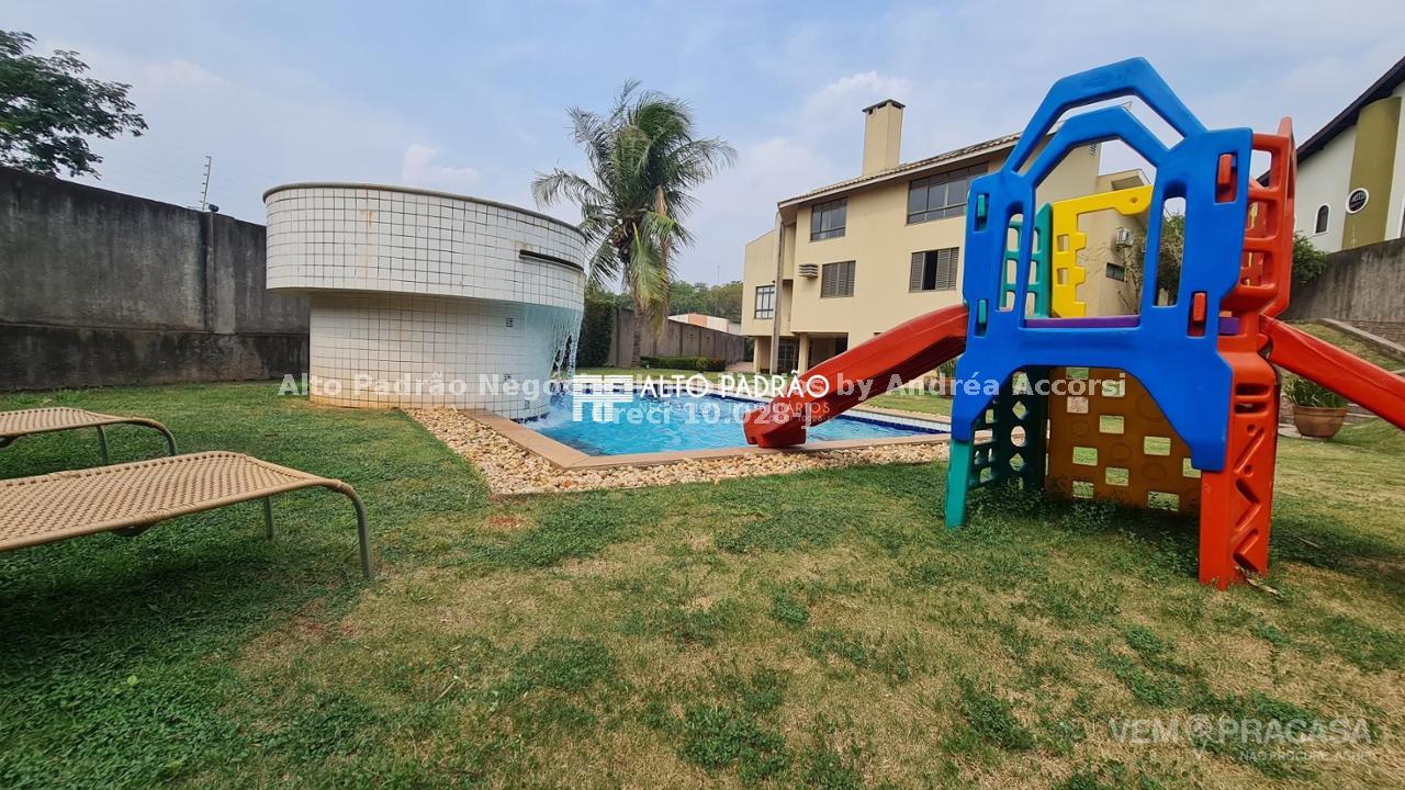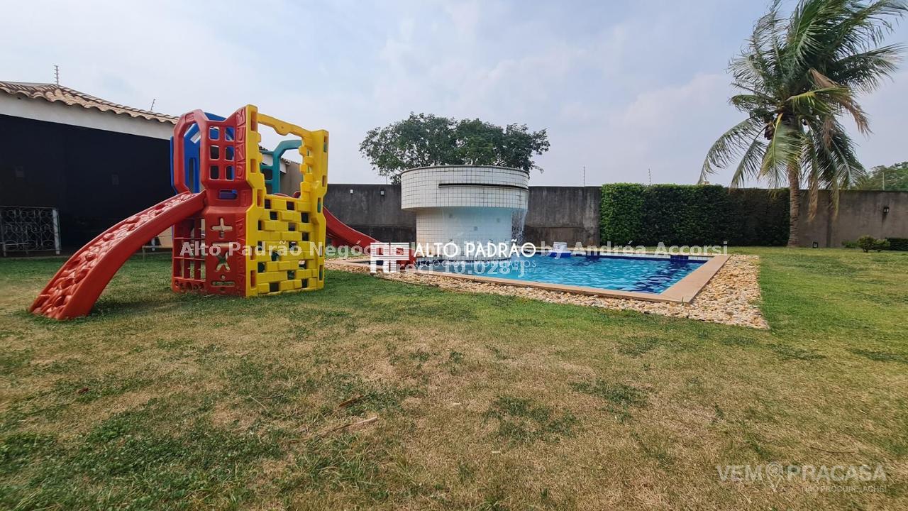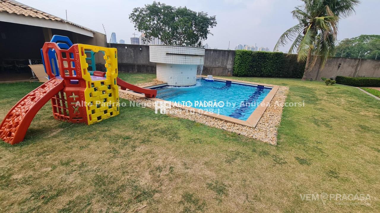 Sobrado amplo com 3 pavimentos. Pavimento térreo: área de lazer com muito verde, árvores frutíferas, piscina com cascata, espaço gourmet, churrasqueira, cozinha e brinquedoteca. Pavimento superior 1: 4 suítes, sala de jantar, sala de TV, cozinha e lavanderia. Pavimento superior 2: sala ampla com lareira e 1 banheiro.