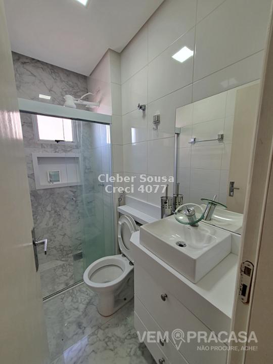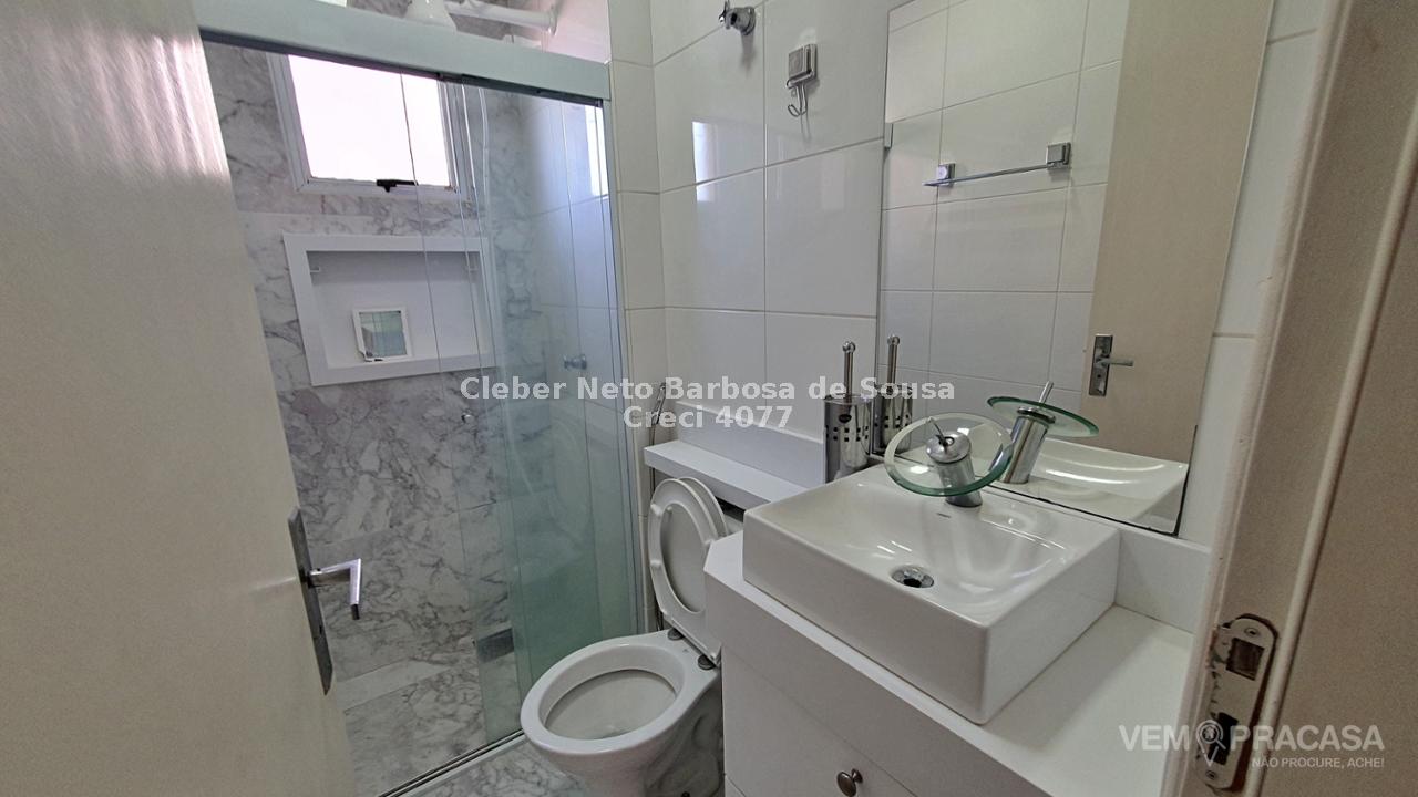 Banheiro social com armário embutido na bancada em pedra sintética nanoglass e com box de blindex com 3 pontos de luz (Piso e área de banho em porcelanato polido de 100x60 imitando mármore)