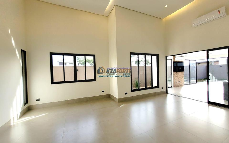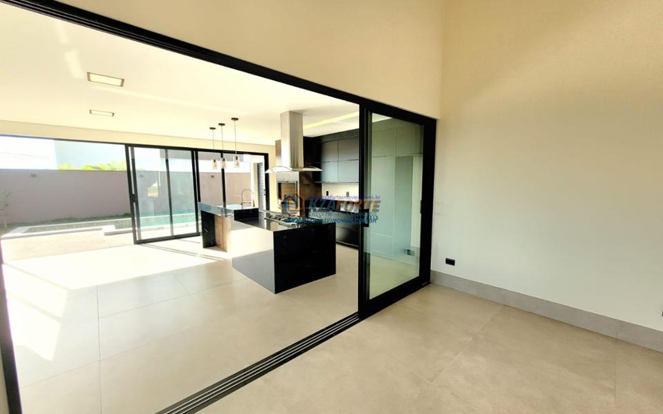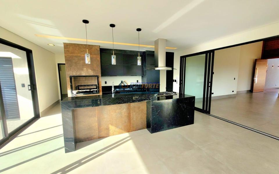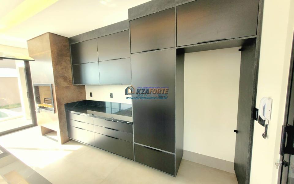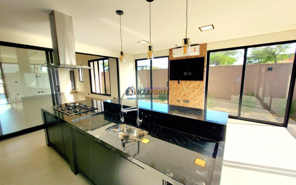 Casa térrea de alto padrão, com arquitetura moderna, sala com pé direito duplo integrada com área gourmet, cooktop em ilha, coifa, churrasqueira com gril, aquecimento de água nas torneiras e chuveiros, banheiros com box, nichos e armários, porta de madeira maciça na entrada, projeto ilumino técnico em LED, sanca em gesso, ambientes com ares condicionados, janelas dos quartos com persianas automatizadas, piscina com aquecimento, piso porcelanato polido, acabamento em mármore e despensa com armários. Condomínio com área de lazer completa, contendo academia, quiosques, salão de jogos, salão de festas, playground, brinquedoteca, piscinas adulto e infantil, quadra poliesportiva e campo de futebol. Valor do Condomínio: R$444,00. Aceita financiamento.