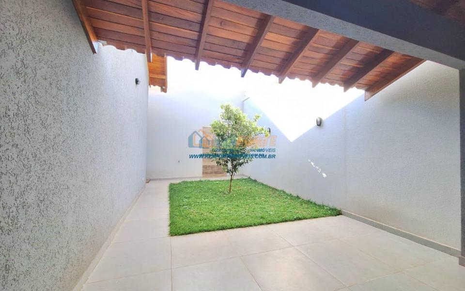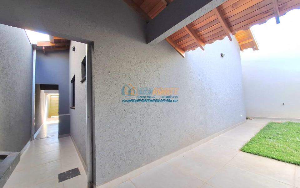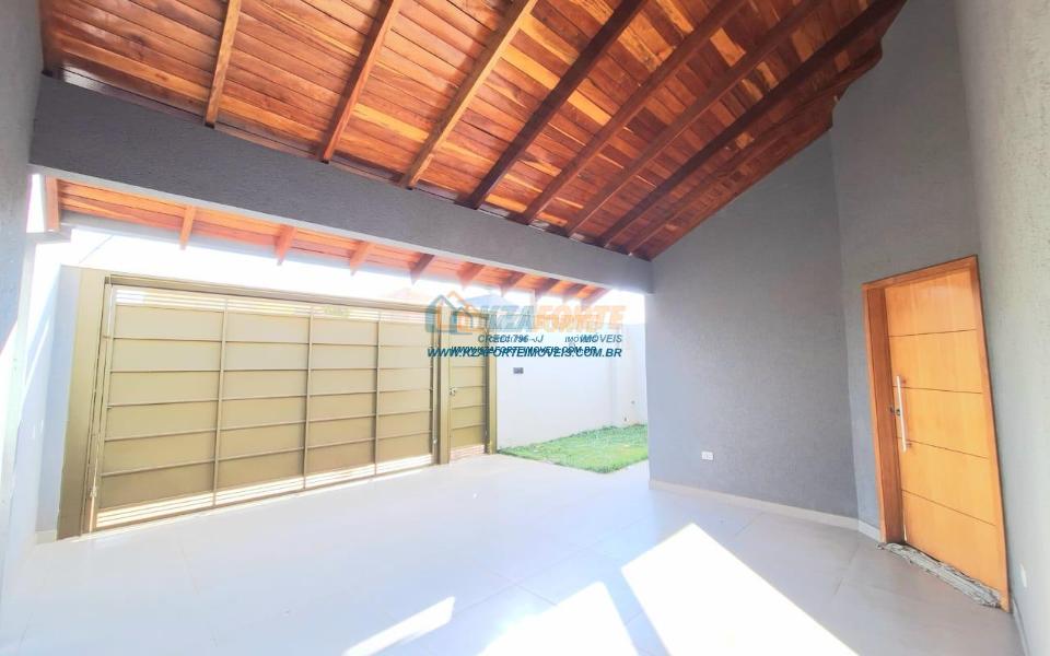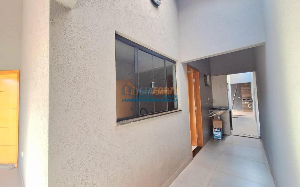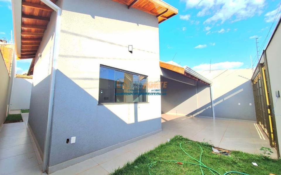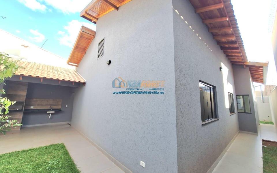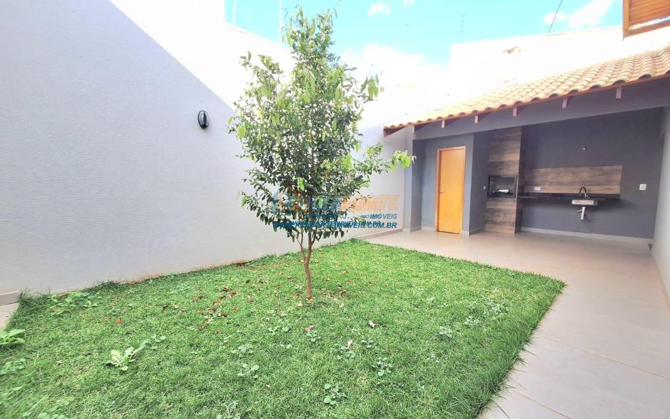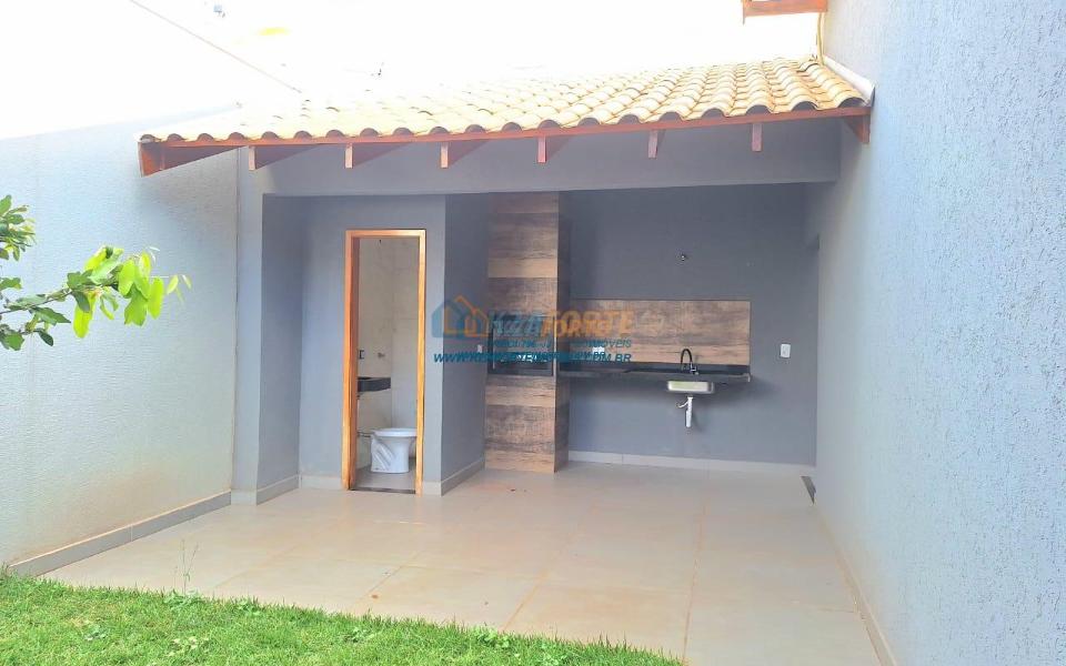 Imóvel de alto padrão, com forro de laje, pisos e revestimentos em porcelanato, possui sala, cozinha com pia e balcão em granito, 1 suíte, 2 quartos, banheiro social, 2 vagas de garagem coberta e 1 descoberta se carro pequeno, área de serviço, área gourmet nos fundos com pia, churrasqueira e lavabo, ducha, espaço livre gramado, caso queira fazer piscina, com corredor nas duas laterais. Excelente localização. Aceita financiamento.