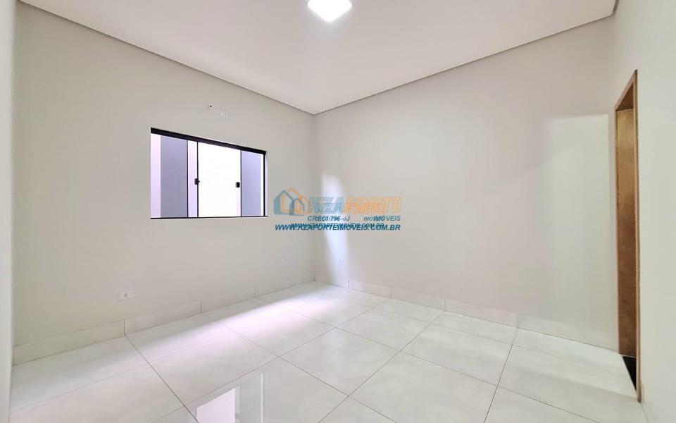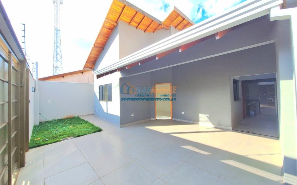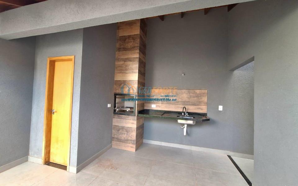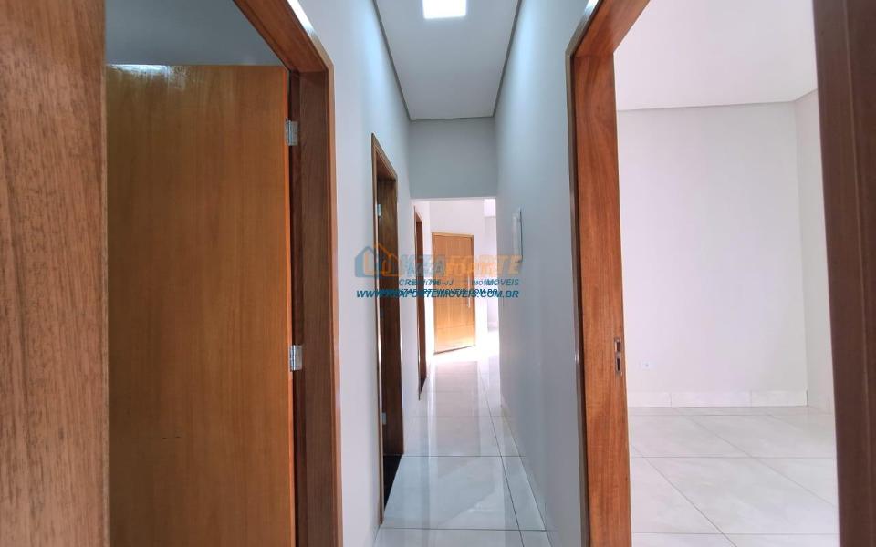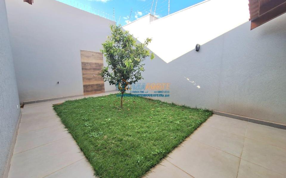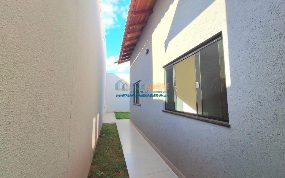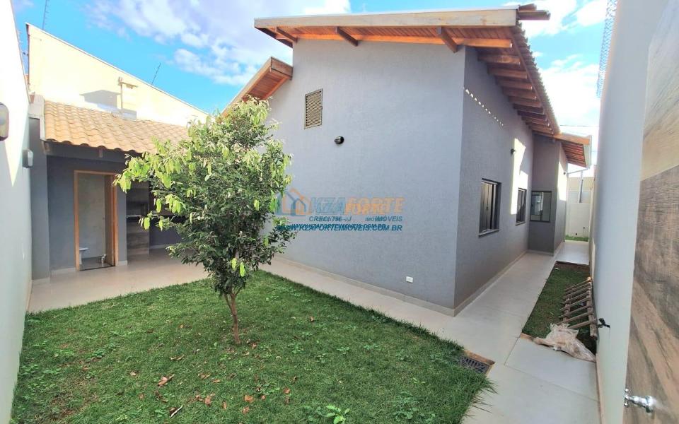 Imóvel de alto padrão, com forro de laje, pisos e revestimentos em porcelanato, possui sala, cozinha com pia e balcão em granito, 1 suíte, 2 quartos, banheiro social, 2 vagas de garagem coberta e 1 descoberta se carro pequeno, área de serviço, área gourmet nos fundos com pia, churrasqueira e lavabo, ducha, espaço livre gramado, caso queira fazer piscina, com corredor nas duas laterais. Excelente localização. Aceita financiamento.