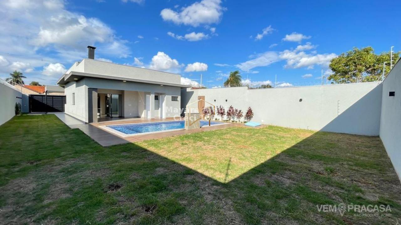 Imóvel com área total de 455m², e área construída de 122m² - 03 quartos, sendo uma suíte + sala de estar/sala de TV + sala de jantar + cozinha americana + churrasqueira + lavabo + 01 Wc social + lavanderia + jardim + piscina + garagem com 04 vagas.