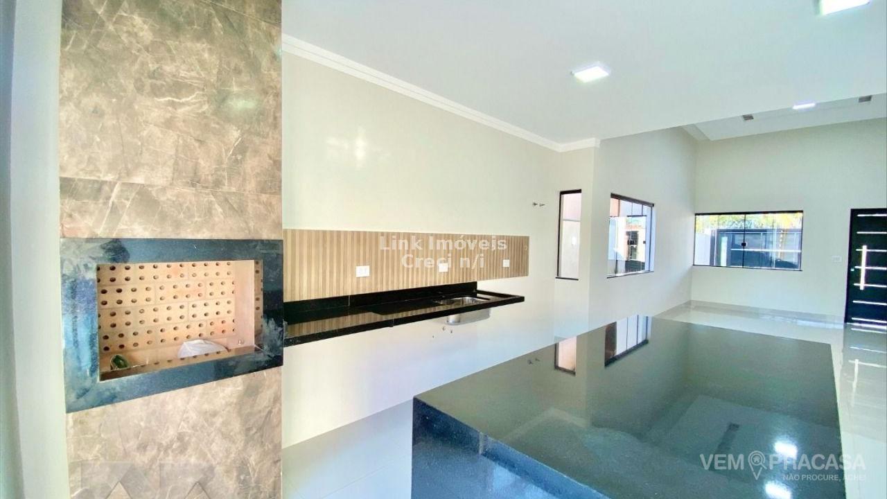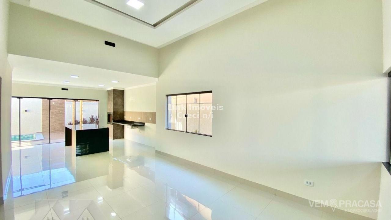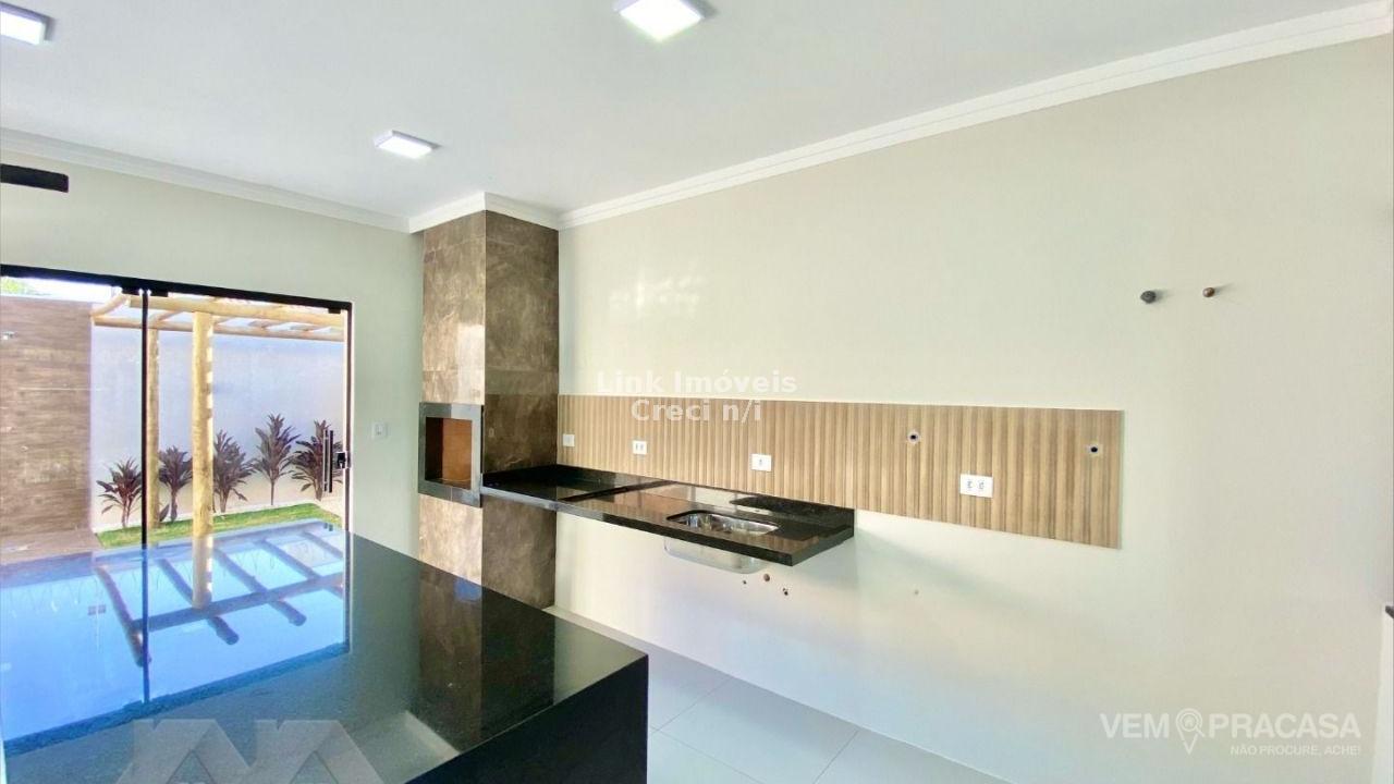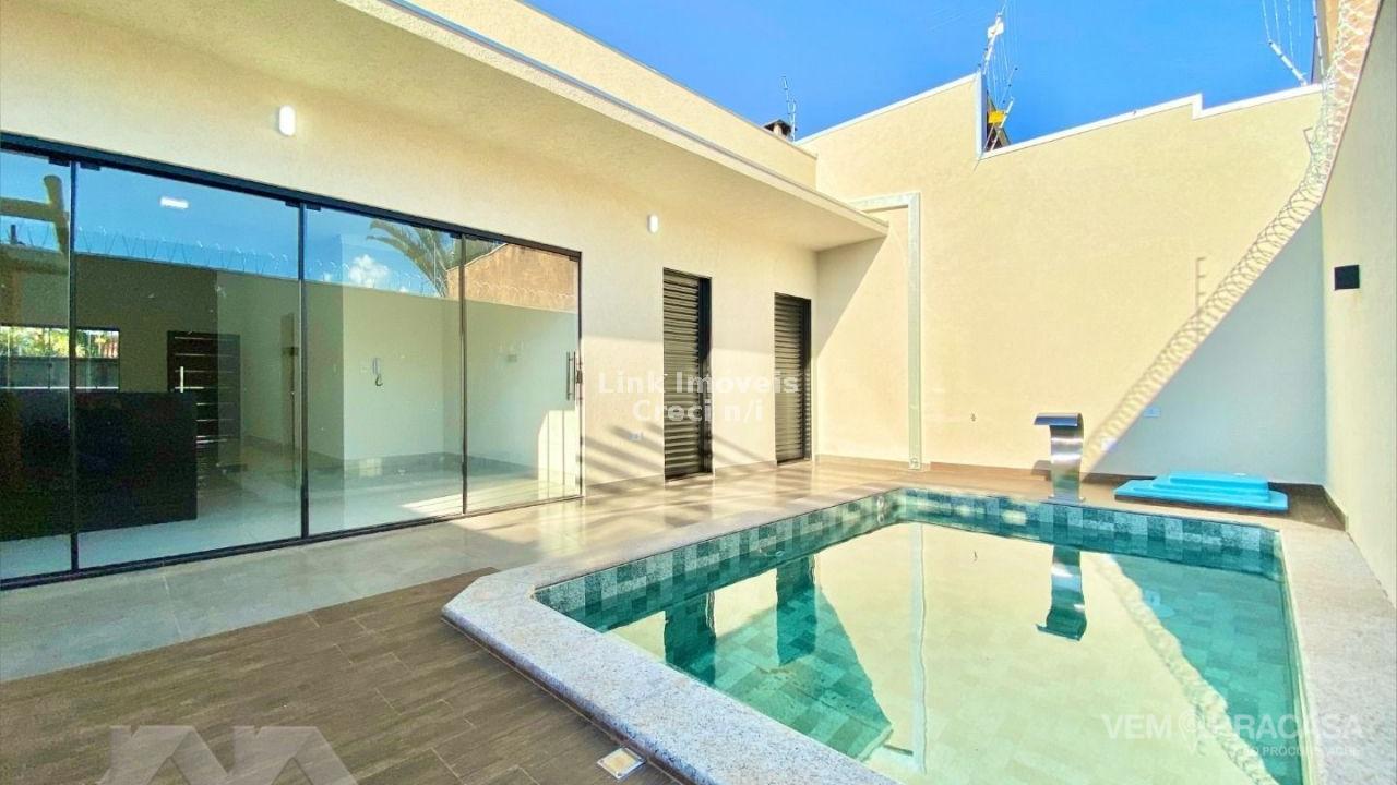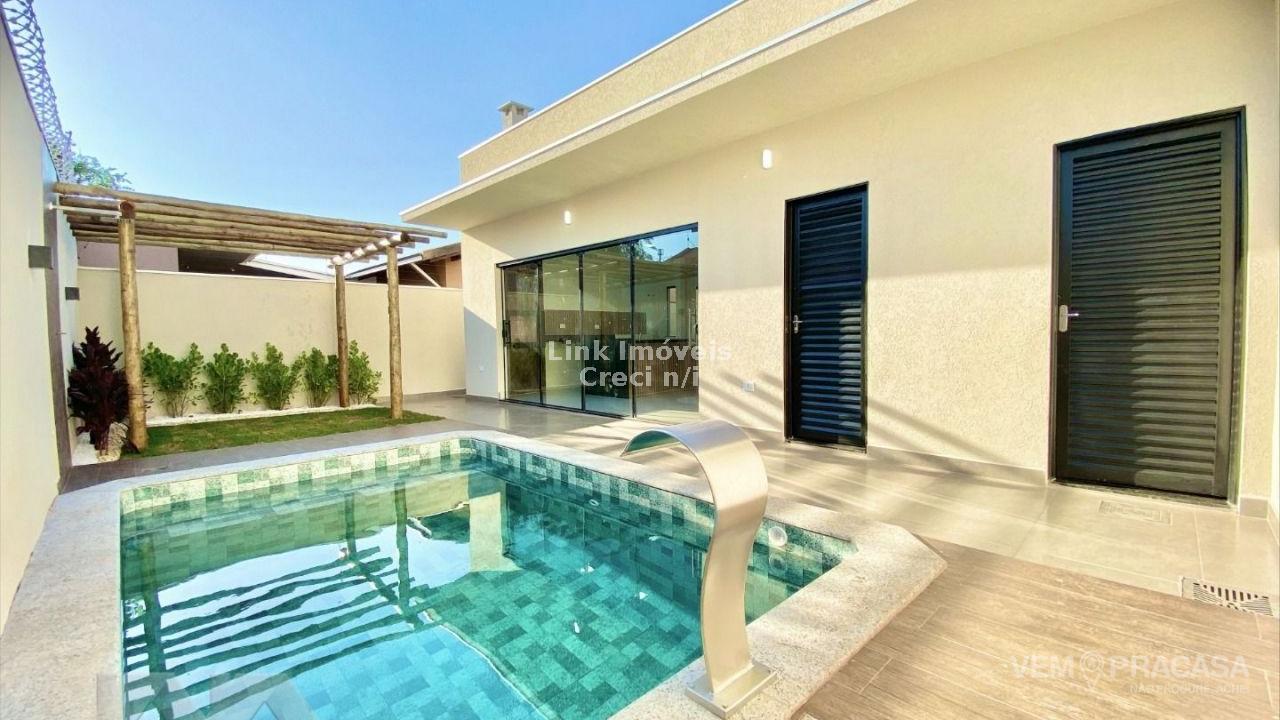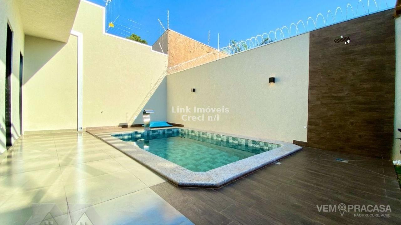 Casa com fino acabamento, sala dois ambientes com o pé direito duplo alto, cozinha gourmet com pia com balcão amplo ilha e churrasqueira, três quartos sendo uma suíte ampla com jardim de inverno privativo, corredor lateral, piscina com cascata e iluminação, pergolado e paisagismo, projeto moderno com acabamentos no teto em gesso e ambiente integrados. Hidráulica para aquecimento solar instalada